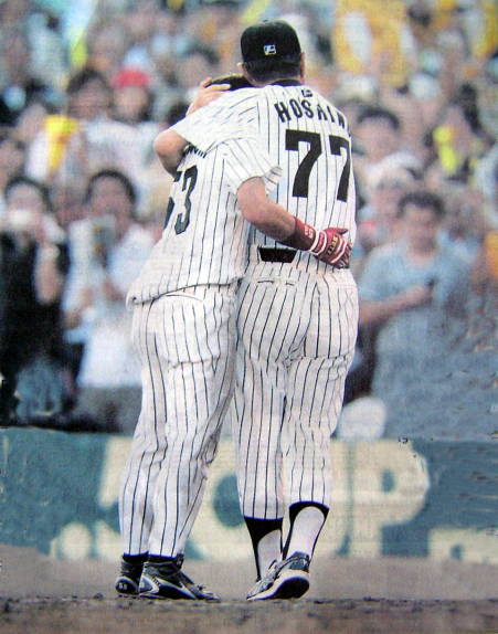 (星野監督とサヨナラ打を打った赤星。この光景は生涯忘れないだろう。)